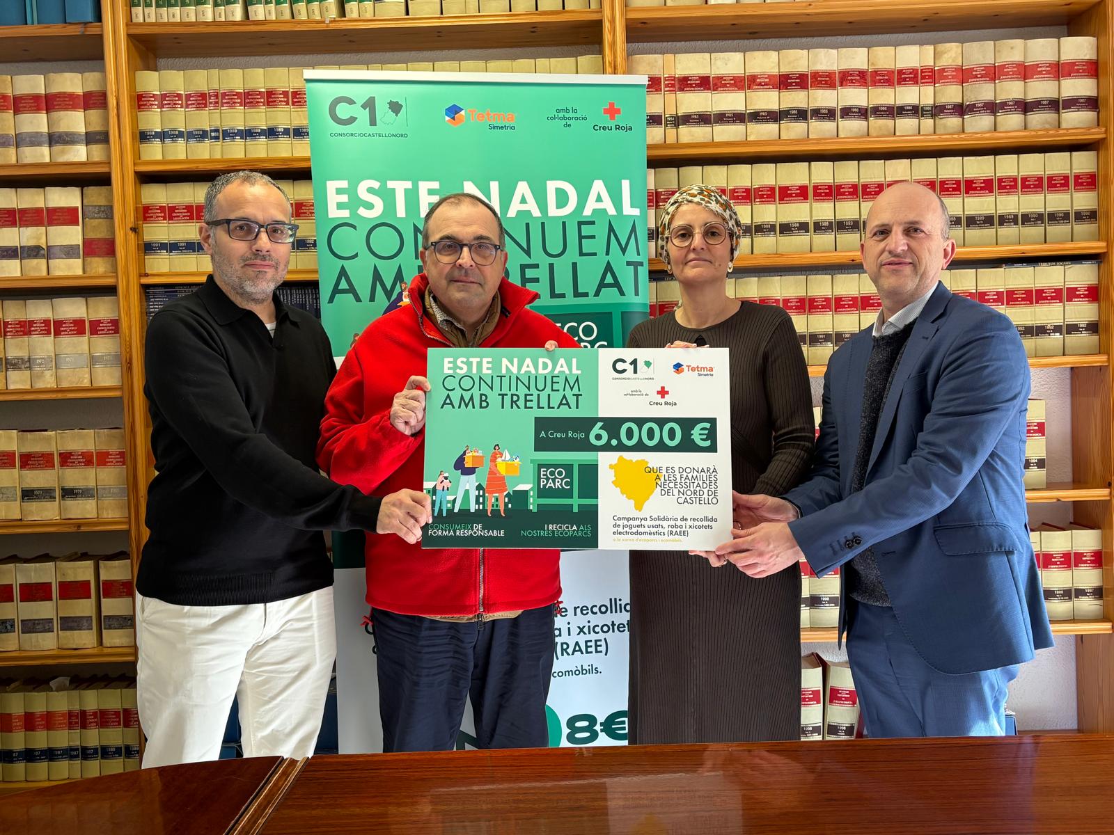16 de enero de 2026.- El Consorcio Castelló Nord, Plan Zonal 1, gracias a la colaboración de la empresa concesionaria Tetma, ha recaudado 6.000 euros para Cruz Roja a través de su campaña “Este Nadal Continuem amb Trellat”, celebrada del 22 al 31 de diciembre. Durante ese periodo se han recogido 50 toneladas al día de residuos en la red de ecoparques consorciados, es decir, un total de 750 toneladas que equivalen a 6.000 euros, ya que, por cada tonelada, se han destinado 8 euros a proyectos de atención a la infancia en el ámbito local en los municipios del norte de Castellón.